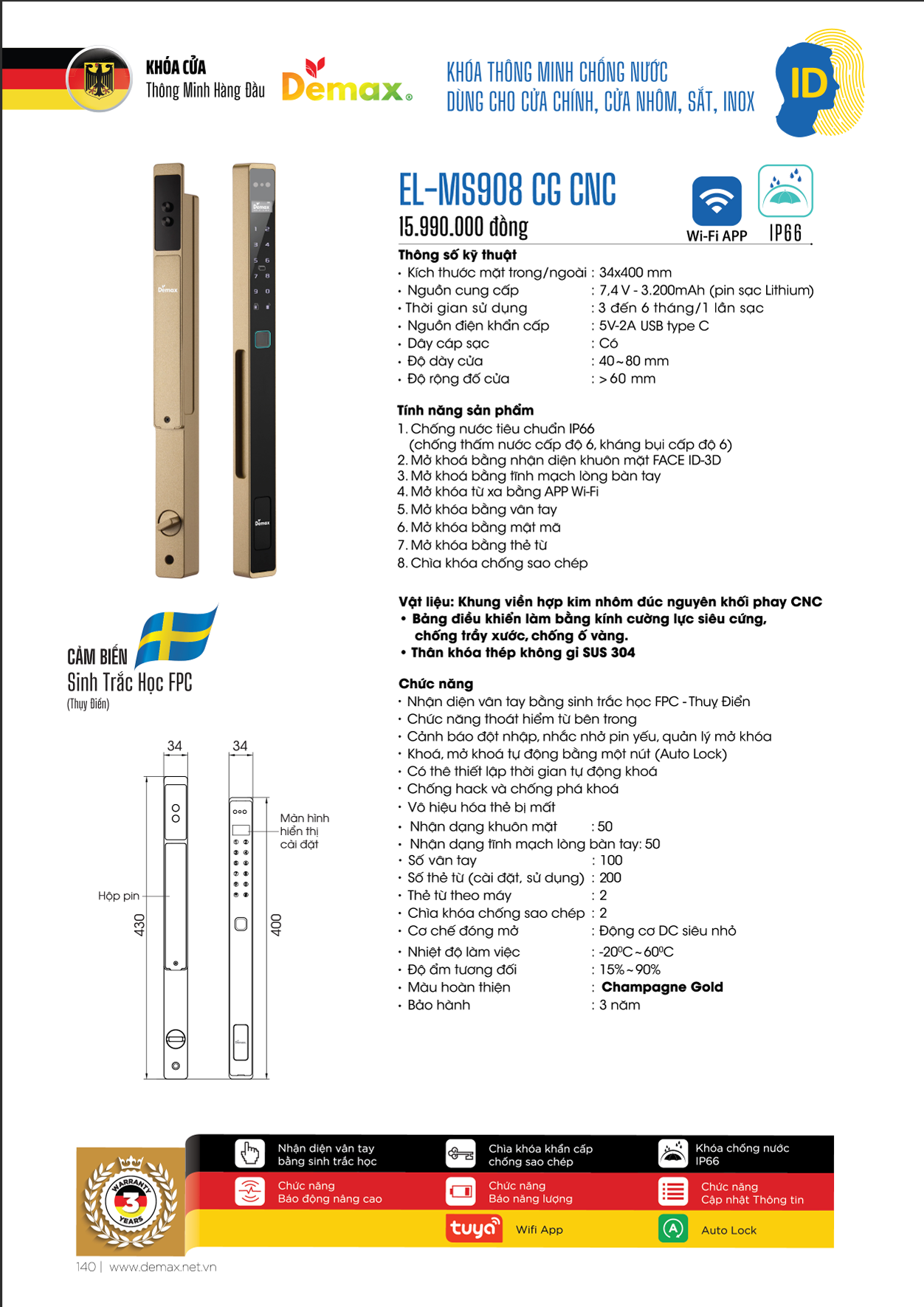 Khóa Vân Tay 2 Mặt Demax EL686 CB (App Wifi + Remote)