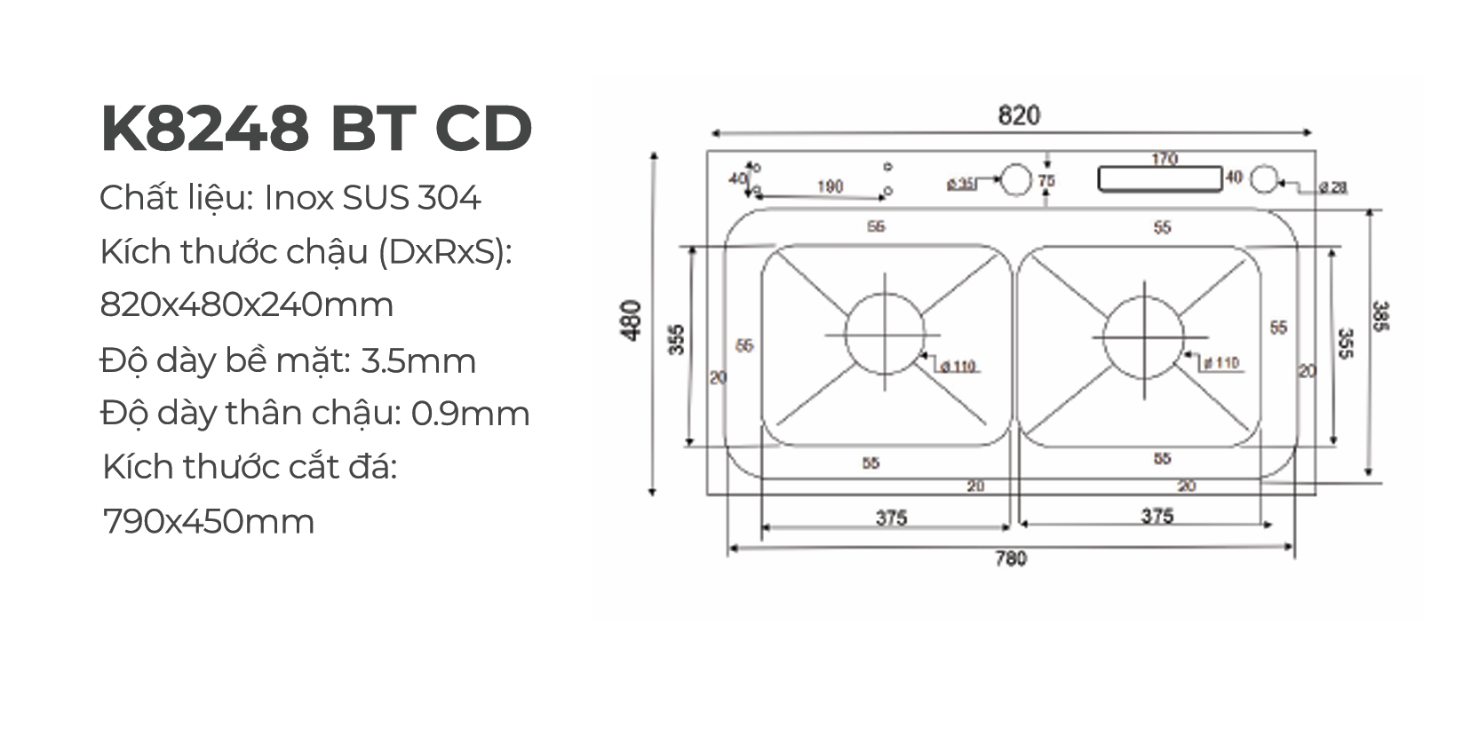 Kích thước chậu (DxRxS): 820 × 480 × 240 mm
