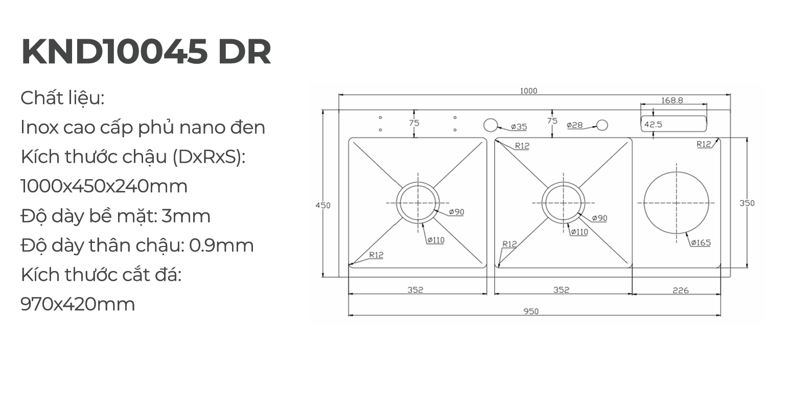 Kích thước chậu (DxRxS): 1000 × 450 × 240 mm