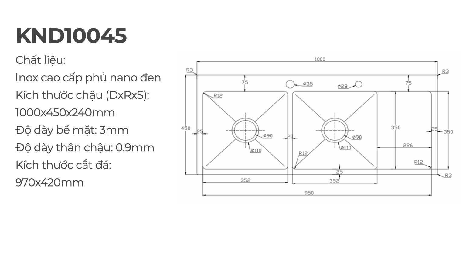 Kích thước cắt đá: 970 × 420 mm