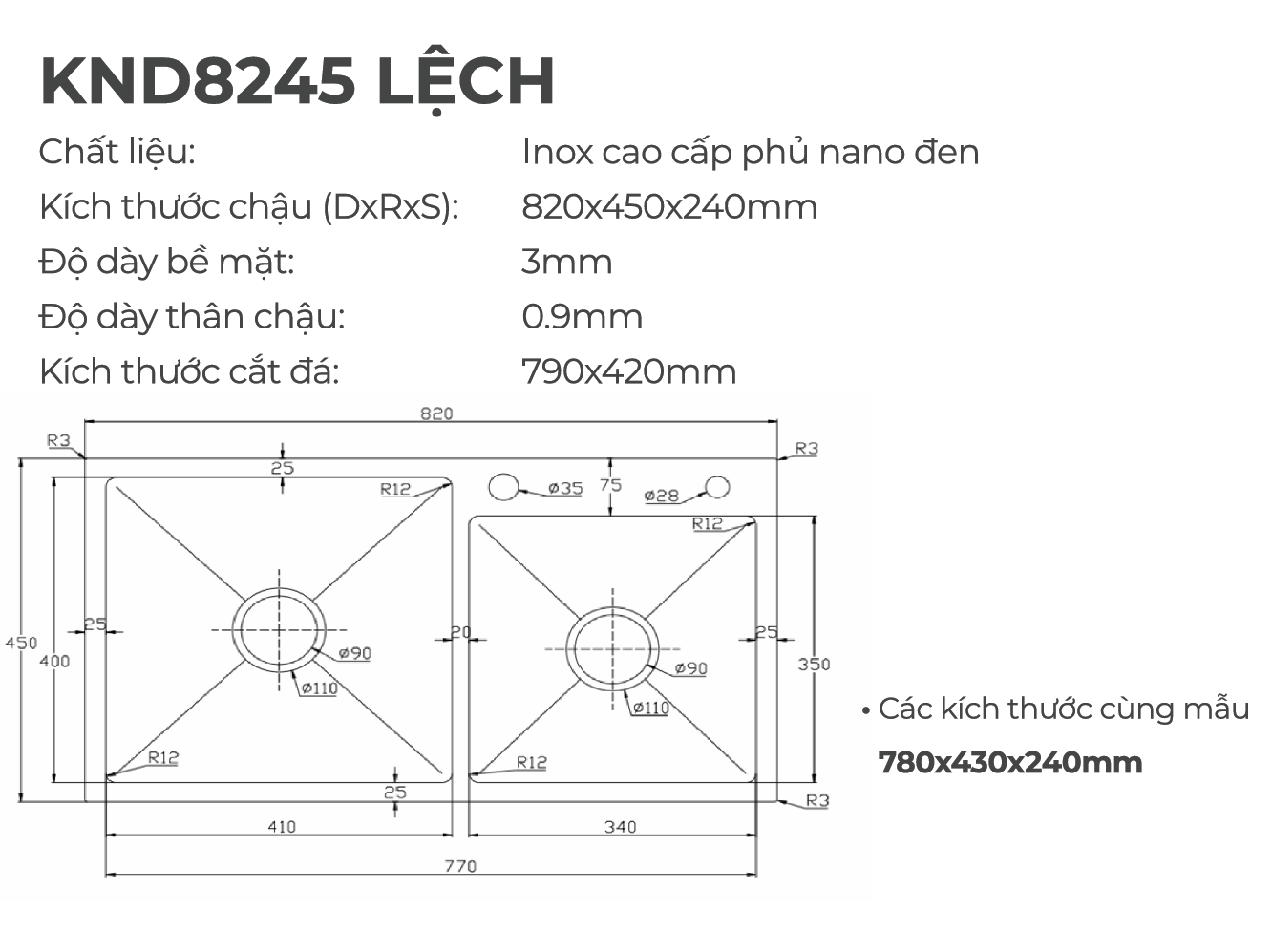 Kích thước chậu (DxRxS): 820 × 450 × 240 mm