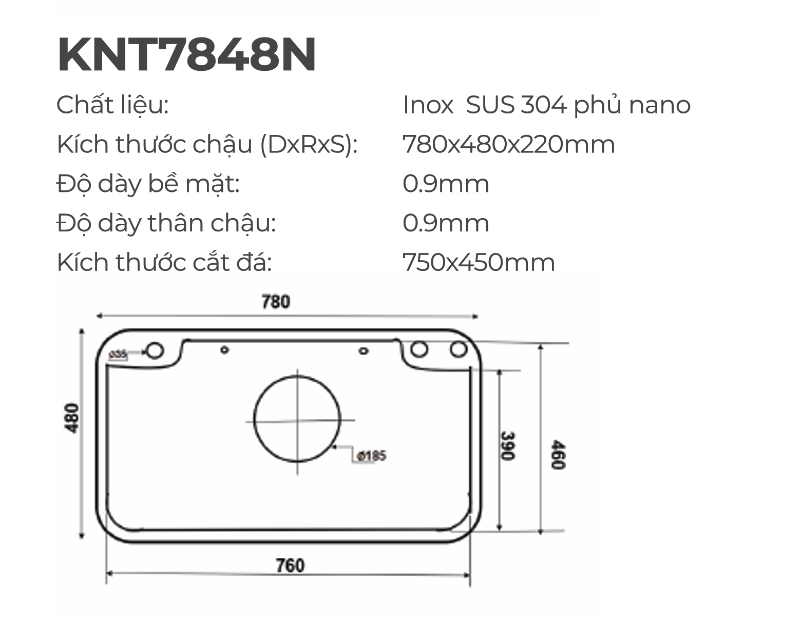 Kích thước chậu (DxRxS): 780 × 480 × 220 mm